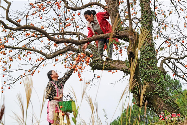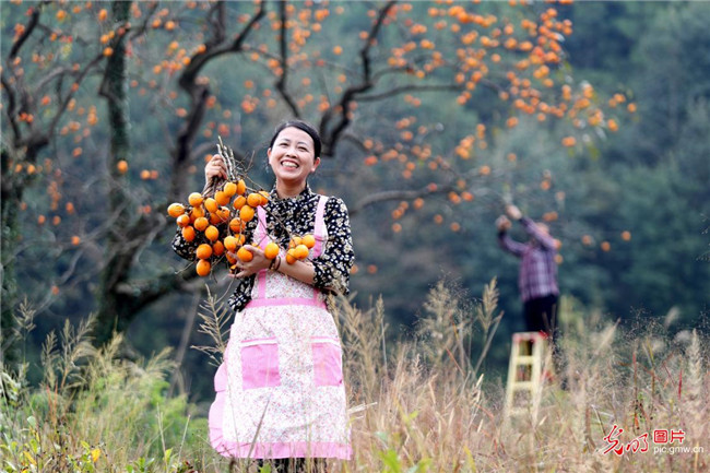 2021年11月1日,江西省撫州市東鄉區楊橋殿鎮秋沅村,成熟的柿子壓滿枝頭,好似小燈籠一般閃耀著紅彤彤的光芒,成了一道獨特的鄉村美麗風景,村民們正趁著晴好天氣采摘成熟的柿子。(何江華 攝/光明圖片)