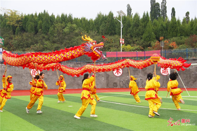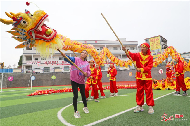 2021年11月2日,湖南省永州市新田縣蓮花學校,學生們在李冬玉老師的指導下學習舞龍技藝。今年,新田縣蓮花學校積極落實“雙減”政策,利用優勢師資舞龍愛好者李冬玉,將非遺文化舞龍運動列入課后服務項目,讓學生在身體得到鍛煉的同時,感受中華傳統文化的魅力。(劉貴雄 攝/光明圖片)