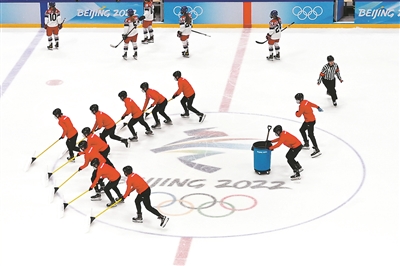 2月5日,“雪童”在冬奧會比賽間隙清掃冰面。國家體育館清雪保障“雪童”團隊由齊齊哈爾市男子冰球青年隊和北京體育大學中國冰上運動學院學生組成。新華社記者 李紫恒 攝