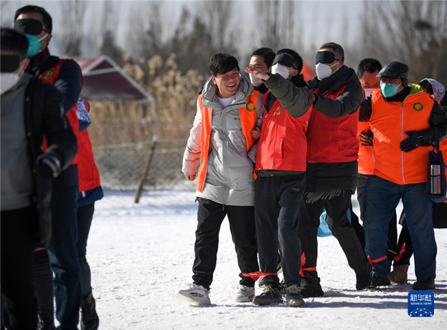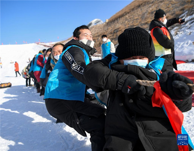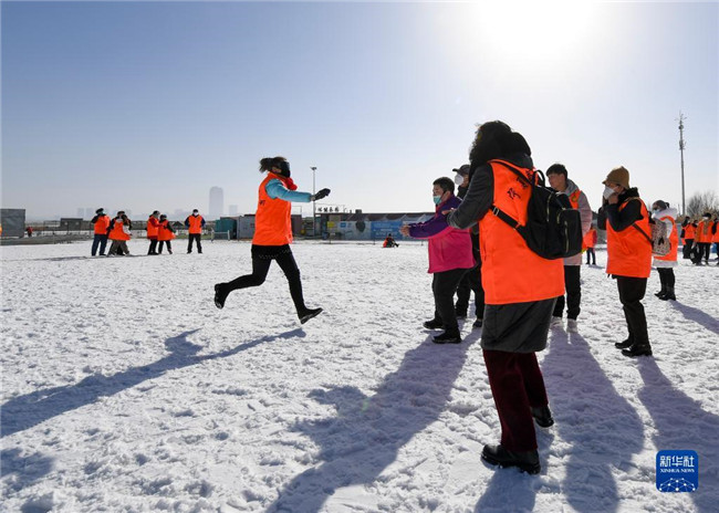 1月18日,殘疾人與志愿者搭檔參加雪地綁腿跑。