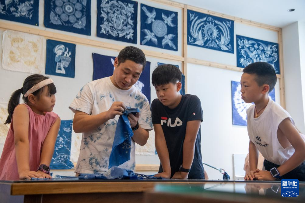 7月10日,在重慶市秀山縣的非遺文創街蠟染館內,蠟染傳承人劉春林(左二)在向青少年傳授染色技巧。