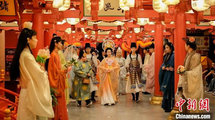 資料圖:長安十二時辰主題街區內舉行的漢服主題活動。(長安十二時辰主題街區供圖)