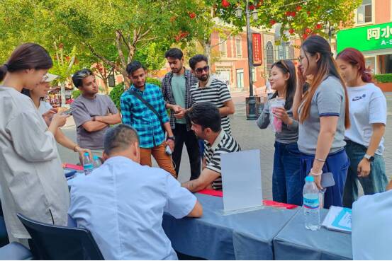 現場還有幾位在附近生活的巴基斯坦友人,他們聽說有中醫診療,專程前來咨詢身體調理問題。在翻譯的協助下,友人們向醫生描述了近期常感腸胃不適、精神不濟的情況。醫生耐心為他們號脈,仔細詢問飲食偏好與作息習慣,判斷存在脾胃運化較弱的情況,隨后建議減少生冷食物攝入,搭配小米粥、南瓜等溫和食材調理,還分享了按揉足三里穴健脾的方法。友人們認真記錄調理建議,用不太流利的中文說著“謝謝”,并對中醫僅通過“摸脈”就能準確判斷身體狀況的獨特方式連連稱奇。