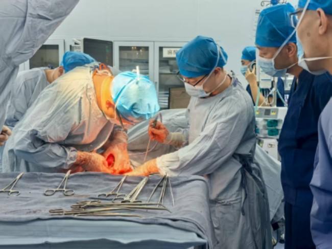 術前CT提示,鋼筋緊貼人體最粗大的下腔靜脈穿行,并已刺入肝臟左葉,手術風險極高,術中稍有不慎即可能引發致命性大出血。在多學科團隊的嚴密配合下,膽胰外科周旭主任指導副主任醫師高恒軍、主治醫師楊發基與王新等,在開腹直視下實施鋼筋取出術。創傷中心主任醫師張鵬與主治醫師趙之孟憑借豐富經驗,沉穩、精準地將鋼筋從緊貼下腔靜脈處緩慢撤出。鋼筋離體瞬間,團隊迅速應對活動性出血,立即行下腔靜脈修補及肝部分切除。隨后,泌尿外科專家確認腎臟無損傷,張鵬主任醫師等對背部和下肢創口進行了徹底清創與縫合。整個手術流程規范有序,團隊處置精準果斷,最終成功挽救了患者生命。