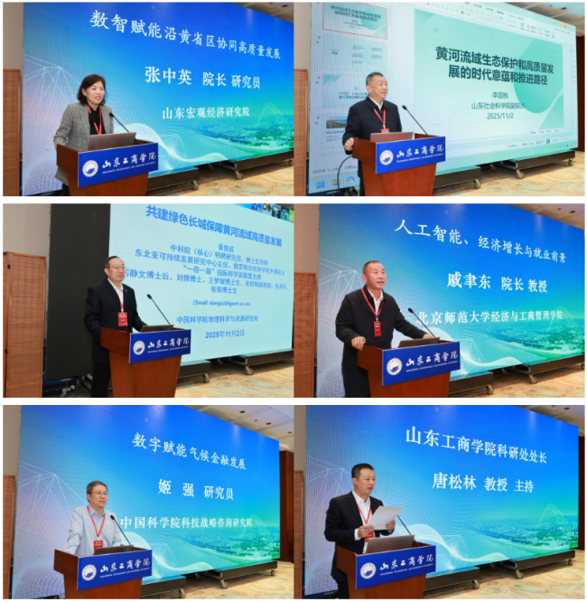 主旨報告環節由山東工商學院科研處處長、經濟學院院長唐松林教授主持。山東省宏觀經濟研究院院長張中英研究員、山東社會科學院副院長李國棟教授、中國科學院地理科學與資源研究所東北亞可持續發展研究中心主任董鎖成研究員、北京師范大學經濟與工商管理學院院長戚聿東教授、中國科學院科技戰略咨詢研究院姬強研究員分別以“數智賦能沿黃省區協同高質量發展”“黃河流域生態保護和高質量發展的時代意蘊和推進路徑”“共建黃河沿岸綠色長城,促進全流域高質量發展”“人工智能、經濟增長與就業前景”“數字賦能氣候金融發展”為題作了精彩報告。
