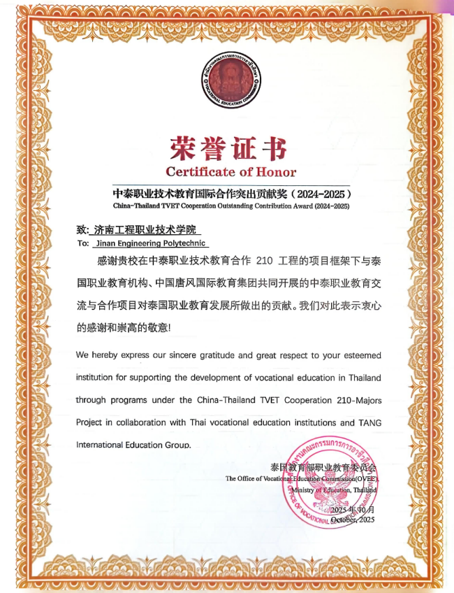 近日,濟南工程職業技術學院榮獲泰國教育部職業教育委員會頒發的“中泰職業技術教育國際合作突出貢獻獎(2024-2025)”,以表彰學院在中泰職業技術教育合作“210工程”框架下,與泰國職業教育機構及唐風國際教育集團開展的卓有成效的合作項目,并為推動泰國職業教育發展所作出的重要貢獻。