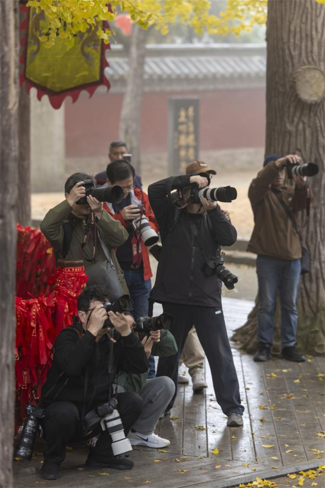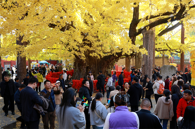 千年銀杏滿冠金黃,紅綢似霞,古寺相依,秋日里盡展歲月與浪漫的交織之美。劉宗麗/攝