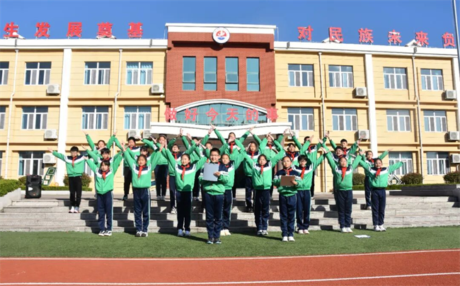伴隨著莊嚴的國歌旋律,五星紅旗冉冉升起,全體師生肅立注目,少先隊員行隊禮,愛國情懷與文明意識在晨光中悄然扎根。