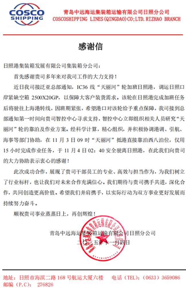 “你們的服務真是太贊了!”日前,客戶將一封感謝信送到日照港,對港口的優質服務表示感謝和肯定。