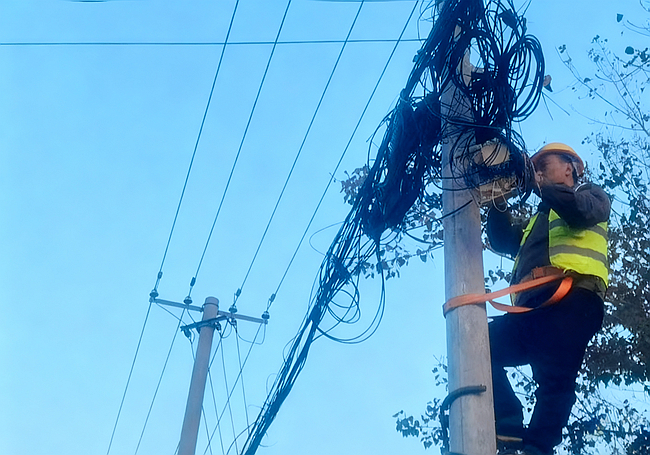 整治現場,工作人員化身“空中美容師”,身背工具包、系緊安全繩,在數米高的線桿上有序作業。他們對錯綜復雜的線纜逐一排查,精準區分在用與廢棄線路,果斷剪除冗余線纜,從源頭消除安全隱患;對正在使用的通信線路,嚴格按照“橫平豎直、牢固美觀”的標準,進行分類捆扎和走向優化,徹底告別“空中蜘蛛網”舊貌。